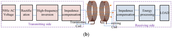 IWPT is the most widely researched wireless power transfer technology, and the working principle is shown in Figure 3a [15,16]. On the transmitting side, the 50 Hz AC voltage is converted to high-frequency AC after rectification and high-frequency inversion, which is sent to the transmitting coil after impedance compensation to establish a high-frequency magnetic field. On the receiving side, the energy received by the receiving coil is used for the electrical load after impedance compensation and electric energy processing. In IWPT technology, the transmitting coil and receiving coil are similar to loosely coupled transformers. The IWPT technology can achieve high output power, even up to tens of kW. However, the transmission distance of IWPT technology is small, generally not exceeding the diameter of the coil.