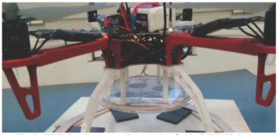 In 2016, researchers from the University of L′Aquila installed a hollow plane receiving coil on the abdomen of the UAV. Under well-aligned conditions, 70 W output power was achieved with 89% efficiency over a distance of 10 cm, and the operating frequency was 150 kHz, as shown in Figure 4 [21].
