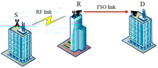 A dual-hop mixed RF-FSO communication system is depicted in Figure 1, which has an RF transmitter (S), an AF relay (R), and an FSO receiver (D). The S and D are equipped with a single antenna or aperture. The relay R converts the radio waves into optical waves with the AF relaying protocol.