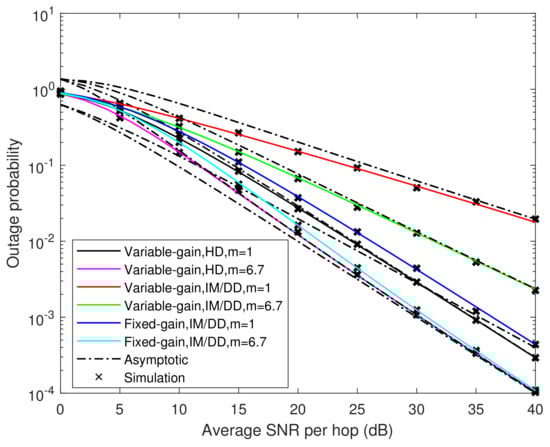 Figure 2 illustrates the outage probability under strong turbulence. The analytical expressions of the outage probability are based on (34) and (41). It is assumed that and . The outage probability decreases as the value of m changes from 1 to . For example, at 16 dB SNR in variable-gain relaying under heterodyne detection, the outage probability is with , while the outage probability increases to with . Moreover, it can be seen that the fixed-gain relaying offers superior performance compared with the variable-gain relaying under the IM/DD technique. For instance, at 28 dB SNR, the outage probability is for the variable-gain relaying, while the outage probability decreases to for the fixed-gain relaying. The reason is that the variable-gain relaying amplifies the noise and interference with the signal, while the relay gain is independent of the channel conditions for fixed-gain relaying. Additionally, the results also demonstrate that the system has better outage performance under HD as compared to IM/DD. For instance, at 28 dB SNR and under the situation of variable-gain relay with , the outage probability is under HD, while the outage probability increases to under IM/DD. Moreover, the asymptotic curves for all terms coincide with the analytical curves at high SNR values, and the simulation results match the analytical results.