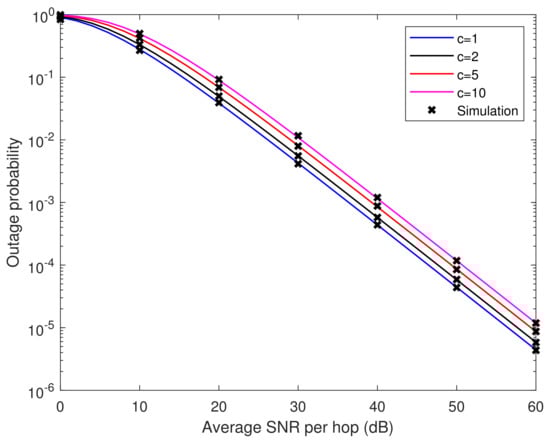 Figure 3 presents the outage probability performance with fixed-gain relaying under strong turbulence with for various C. The outage probability performance becomes worse when the value of C becomes larger (i.e., the fixed gain becomes smaller). For instance, the outage probability decreases from to when the value of C decreases from 10 to 1 (fixed gain increases).