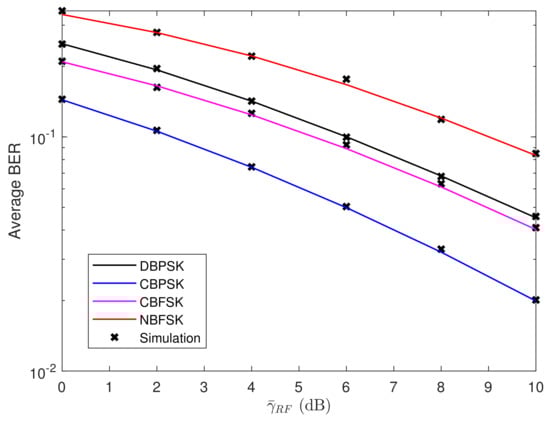 where p and q are determined by particular types of modulation schemes [35]. The coherent binary frequency shift keying (CBFSK), coherent binary phase shift keying (CBPSK), non-coherent binary frequency shift keying (NBFSK), and differential binary phase shift keying (DBPSK) are given by (p, q) = (0.5, 0.5), (0.5, 1), (1, 0.5), (1, 1), respectively.