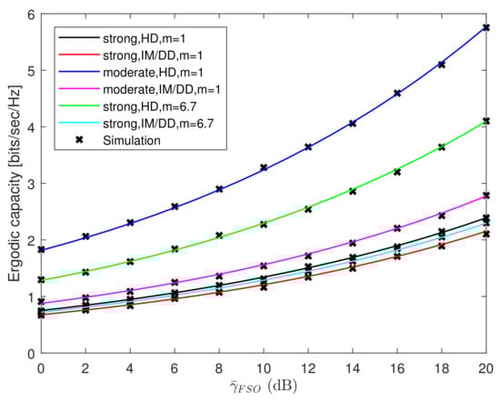 The definition of ergodic capacity is , where for HD and for IM/DD [35]. With the help of the CCDF , the ergodic capacity can be written as:
