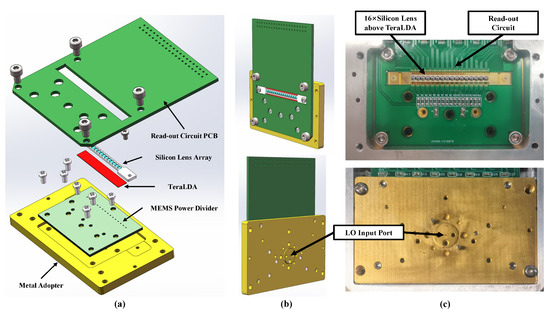 The designed receiver front-end consists of a silicon lens array, a 16-pixel TeraLDA combined with two 8-pixel TeraLDAs, a 16-way power divider, and 16-way read–out circuit. The exploded view of the receiver front-end is shown in Figure 15a.
