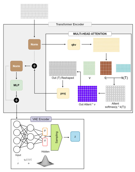 is the lower limit of the variation for data x, and is the KLD from to approximating [9,25]. To summarize this encoder process, the input image is divided into patch-level images, each separate image learns the global information of the image through the MSA in the ViT encoder, and the MLP finds the features of the image. The image features found in this way are compressed through the VAE, the mean and deviation are obtained, and the feature information is extracted with a similar variance by sampling. Since ViT does not learn information by distributing image features in the past, the VAE can help with the disadvantage of a large number of datasets being required by creating image feature information in a distributed form. The image features extracted from the ViT encoder are compressed in the VAE encoder. A slightly lower-dimensional representation vector can be obtained in this compression process. ViT does not use variance for features extracted from the input data, but the VAE performs compression and computes the mean and variance of the features extracted from the input data. This is a distributed form that is not present in the existing ViT encoder results, and it is possible to obtain more feature information in a form similar to the image data features. This results in alleviating the problem that ViT is dependent on the existence of a great deal of data because there is no inductive bias.