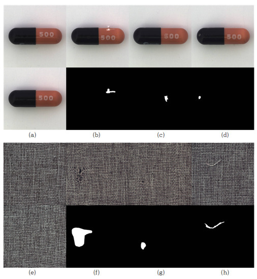Normal and abnormal images for the capsule and carpet included in the MVTecAD dataset. For the capsule and carpet, (a,e) are normal images and (b–d,f–h) are defective images and abnormal mask images, respectively. The reason for the defect in the abnormal images of the capule is: (b) crack; (c) faulty imprint; (d) fork. The reason for the defect in the abnormal images of the carpet is: (f) cut; (g) hole; (h) thread.
