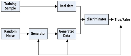 The fundamental structure of a GAN is depicted in Figure 1; it is primarily composed of two deep networks called generative and discriminant networks. The primary function of a generative network is to generate generated data that follow a specified distribution and are extremely similar to real data. The discriminant network’s primary function is to accurately distinguish real data from data generated by the generator [35,36].