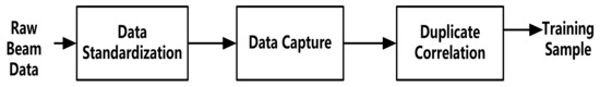 In this paper, the beam output signal of the underwater target echo received by the active detection systems of underwater high-speed vehicles in the pool test data is taken as the basis and then processed as the training sample input. There are two primary reasons for not directly feeding the neural network the output data from the original beam. First, the original signal’s weak target characteristics would increase the difficulty of training the network. To be more specific, a weak target means that the target signal is weak, the signal-to-noise ratio is low, and it is not easy to detect. The weak target characteristics of the original signal not only easily lead to the problem of high missed detection rates using the mainstream signal detection methods but also lead to corresponding signal characteristics that are easily affected by background and noise, resulting in problems such as identification difficulties. In addition, the weak target characteristics of the original beam lead to the problem that a target whose spectral energy is less than the noise is smoothed, which ultimately leads to the target being unable to be effectively detected. Therefore, using output data from the original beam makes network training more difficult. Second, because of the large dimension of the original signal’s sample, there would be an excessive number of network training parameters and an exponential increase in the amount of calculation required. A multi-dimensional disaster would occur due to such a huge increase in the pressure on the computer. This paper aims to perform data standardization, data interception, and copy-related processing on the original echo data to reduce the data dimension and enhance the target features for application to the neural network model. Figure 2 illustrates the signal processing process.
