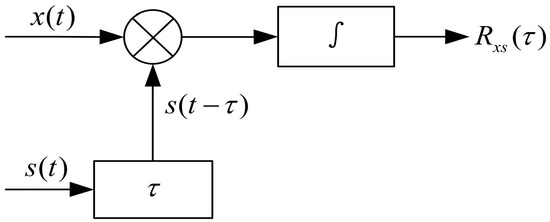 In Figure 3, x(t) denotes the signal received by sonar, s(t) represents the reference signal (the copy of the signal transmitted by sonar is generally taken), is the signal delay time, and the output is the cross-correlation function. When the signal delay time is equal to the time delay of the target echo, the cross-correlation function can obtain the maximum value, referred to as the copy correlation peak.