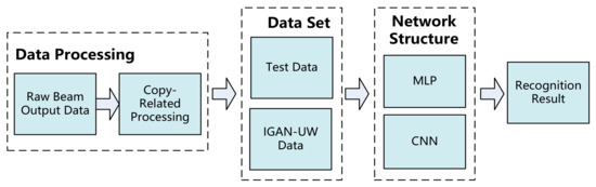 As shown in Figure 5, based on the original underwater acoustic target samples obtained in the pool test, this paper designs an underwater target recognition neural network modeling scheme based on IGAN-UV. Based on the original target data, the copy-correlated samples with one-dimensional characteristics are obtained. Due to the insufficient amount of original data, the sample size of the copy-correlated data obtained is insufficient to support neural network training, and the result is not ideal. Therefore, the sample size is expanded using the GAN network. Based on the expanded underwater target sample set, a convolutional neural network model is established to classify and verify the underwater acoustic data samples. For copy-correlated samples, operations such as convolution and pooling in the common convolutional neural network can be transformed into n*1 to adapt to sample characteristics.