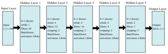 In contrast to the traditional image generation task (which uses a two-dimensional matrix as the training sample), the sample for the echo signal generation task uses a one-dimensional vector. As a result, the GAN’s fundamental unit should be a full connection layer or a one-dimensional convolution layer. The convolutional structure has the characteristics of a local sensing field and weight sharing; this not only reduces the number of parameters and the complexity of the network model but also ensures invariance at large scales and translations, making it widely applicable. As a result, this paper chooses a one-dimensional convolutional structure as the primary operating unit of the GAN. A GAN is composed of two modules: a generative network and a discriminant network. The generated network’s detailed structure is illustrated in Figure 6, where deconv denotes the deconvolution layer, stride denotes the step size, filters denote the number of channels in the convolutional core, BatchNorm denotes batch normalization, and activation denotes the activation function. The generative network is composed primarily of three layers: an input layer, an output layer, and five deconvolution units. To avoid the gradient disappearing, the leaky ReLU function is chosen as the activation function of the first four deconvolution units; the tanh function is chosen as the activation function of the fifth deconvolution unit to ensure that the output is between −1 and +1. Additionally, batch normalization is applied to the first four deconvolution units to accelerate convergence and avoid over-fitting.