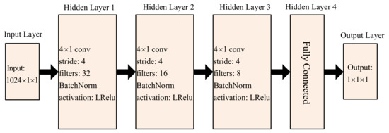 The discriminant network’s detailed structure is depicted in Figure 7, where conv denotes the convolution layer and the label Fully Connected represents the fully connected layer. Discriminant networks are composed of an input layer, an output layer, three convolution units, and a fully connected layer. Similarly, the leaky ReLU activation function is chosen for the three convolutional units and the fully connected layer to avoid gradient disappearance; batch normalization is also added to the three convolutional units to improve convergence and avoid over-fitting.