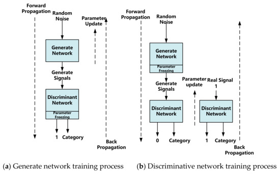 Figure 8. Schematic diagram of the GAN training process. - Train the discriminant network. A discriminant network (decision maker) tries its best to distinguish between real pictures and false signals (signals generated by the generator). The parameters of the generated network are frozen, and only the discriminant network’s parameter training process is updated, as illustrated in Figure 8b. A discriminant network has two types of input. One is the signal generated by random noise passing through the generated network, and its associated label is false (0). One is a real signal, and the label to which it corresponds is real (1). The output is either true or false information (0/1). To be more specific: first, send a real signal to the discriminator, mark the sample as true, and train the discriminator; second, the generator generates a false signal, sends it to the discriminator, marks the sample as false, and trains the discriminator;