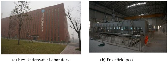 The underwater echo data used in this paper are all from experimental tests conducted at the anechoic pool at the Xi’an Institute of Precision Mechanics. Figure 9 illustrates the experimental platform, with the Key Laboratory of Underwater Information and Control in Figure 9a, and the anechoic pool in Figure 9b.