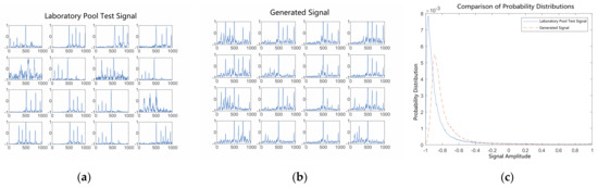 After 100 rounds of training, Figure 11 compares the generated signals with the pool test signals. Figure 11a depicts the waveforms of 16 randomly selected test signals. Figure 11b depicts the waveforms of 16 randomly generated signals. The amplitude probability distributions of the test signals and generated signals from 288 pools are compared in Figure 11c. It can be seen in the figure that after 100 epochs of training, the generated signals from a subset of the 16 random signals gradually maintain a shape similar to that of the pool test signals. The amplitude probability distributions of the signals show that the generated signals appear to be close to the shape of the distribution of the pool test signals.