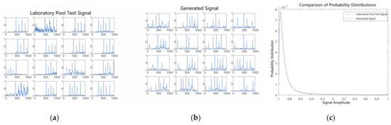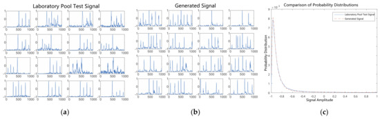 Comparison of generated signals with pool test signals after 150 epochs of training. (a) Laboratory pool test signals. (b) Generated signals. (c) Probability distributions of signal amplitudes.
