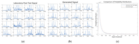 Comparison of generated signals with pool test signals after 200 epochs of training. (a) Laboratory pool test signals. (b) Generated signals. (c) Probability distributions of signal amplitudes.
