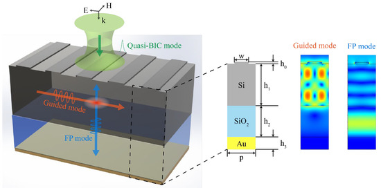The quasi-BIC-based high-Q absorber in this work is composed of a Au substrate, a SiO2 spacer, and a Si layer from bottom to top, with gratings engraved on top of the Si layer (left panel in Figure 1). In this structure, BIC originated from the coupling between a guided mode and an FP mode. The guided mode horizontally propagates inside the Si layer (since the refractive index of Si is higher than that of SiO2), while the FP mode vertically oscillates between the Si and SiO2 layers (right panel in Figure 1). The Au substrate serves as a bottom mirror to prevent transmission and absorb the incident light. The SiO2 layer is used to separate the guided mode from the Au substrate to reduce the resistive loss. The resonance of the guided mode is determined by the period of gratings and the thickness of the Si layer, while that of the FP mode is determined by the thickness of both Si and SiO2 layers. Since the factors affecting the resonance of both modes slightly differ from each other, it is possible to tune one mode while maintaining the other. Thus, it is feasible to independently tune the resonant wavelength and the Q factor of the quasi-BIC mode. The cross-section of a single period is demonstrated in the middle panel of Figure 1, where w represents the width of the grating; p is the period; h0 is the grating thickness; h1 is the Si layer thickness; h2 is the SiO2 layer thickness, and h3 is the thickness of the Au substrate.