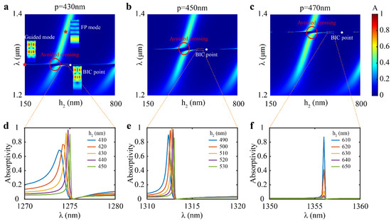 The BIC point (white point in Figure 2a–c, where the peak absorptivity is zero) occurs in the vicinity of the avoided crossing (red circled area in Figure 2a–c). It is situated at the track of the guided mode and far from the track of the FP mode, and the quasi-BIC modes around the BIC point almost share the same resonant wavelength. The h2 values of each BIC point are about 480 nm, 560 nm, and 660 nm corresponding to p = 430 nm, 450 nm, and 470 nm, respectively. By comparing Figure 2a–c, it is noted that the resonant wavelength of the quasi-BIC mode is relevant to the period p and is hardly influenced by the thickness of SiO2 layer h2.
