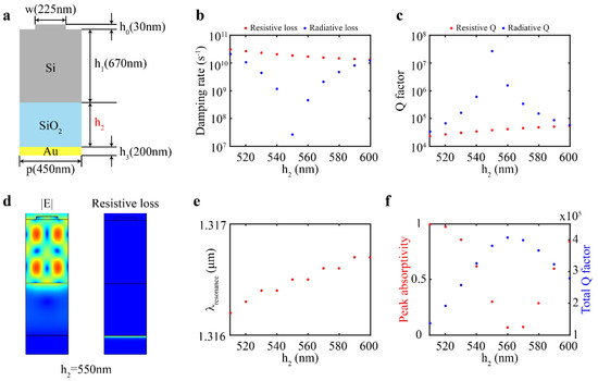 To further study the mechanism behind the Q factor and the peak absorptivity of the quasi-BIC mode, the energy damping rate was simulated by using the eigenfrequency method. Different parameters (p, h2, h0 + h1, etc.) influence the coupling between the guided mode and the FP mode in a similar way, i.e., by tuning the phase difference between these two modes. Since the period p was used to determine the resonant wavelength and the SiO2 layer thickness h2 was used to tune the coupling, h2 was set as the only variable in the following simulation, with other structure parameters as h0 = 30 nm, h1 = 670 nm, h3 = 200 nm, p = 450 nm, and w = 225 nm (Figure 3a). When h2 is changed from 510 nm to 600 nm (the BIC point is within this range), the damping rate of resistive loss maintains the magnitude of 1010 s−1, while that of radiative loss experiences a huge change from 107 s−1 to 1010 s−1 (Figure 3b). This indicates that h2 mainly influences the radiative loss and slightly influences the resistive loss. The change of resonant wavelength stays within 1 nm during the tuning of h2 (Figure 3e). For h2 = 550 nm (near the BIC point), the damping rate of resistive loss is nearly three orders higher than that of the radiative loss. According to the coupled mode theory [38], resistive and radiative losses serve key roles in tuning the Q factor and the peak absorptivity. Thus, the mechanism behind the Q factor and peak absorptivity tuning is that h2 can change the radiative loss.