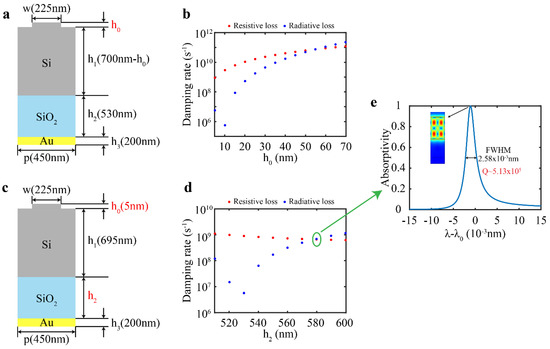 Design for increasing Q factor. (a) Schematic of the structure (grating thickness h0 is the variable parameter). (b) Damping rates versus h0 plots. Red and blue dots represent resistive and radiative losses, respectively. Grating thickness h0 is varied from 5 nm to 70 nm, with an interval of 5 nm. (c) Schematic of the structure (h0 is set as 5 nm, and the SiO2 layer thickness h2 is varied). (d) Damping rates versus h2 plots. SiO2 layer thickness h2 is changed from 510 nm to 600 nm, with an interval of 10 nm. (e) Absorptivity curve for the green circled structure parameter in (d). Inset represents the electric field distribution at the peak, λ0 = 1323.375 nm.