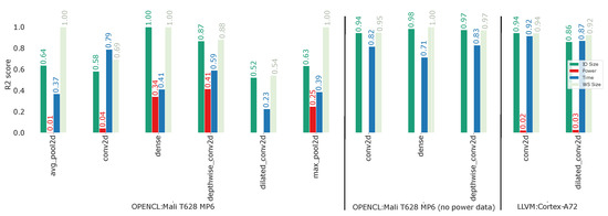 None of the cited publications target the prediction of performance metrics for Deep Learning programs that have been optimized by a search-based compiler, such as TVM [39]. These compilers try to find the optimal implementation for the current layer hyperparameter configurations in combination with the targeted hardware environment. The referenced publications target Deep Learning frameworks, such as Caffe [40], Theano [41], TensorFlow [42], and PyTorch [43] instead, which rely on math-kernel libraries such as Intel MKL [44,45], Nvidia cuDNN [46], ARM CMSIS [4], and others to provide hand-optimized—but static—kernels for each combination of workload type and specific hardware target. TVM utilizes an AI-based solution called autoTVM [47]. This solution tries to automatically find the best function kernel implementation for the current scenario of hyperparameter configurations and hardware environment. To reduce the number of on-device sampling runs a performance model is trained that allows for the estimation of the performance of different kernel implementations without having to benchmark them. It uses XGBoosted Trees [12] for the regression models and simplifies the task by assigning relative scores to the different configurations instead of predicting the absolute performance numbers. This solution is not directly comparable to the related work and our own contribution as it is designed for a very different use case.