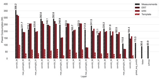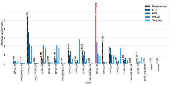 Lu et al. [38] predict the execution time, energy usage, and memory allocation for Deep Learning inference tasks on the Nvidia Jetson TK1 (Nvidia Jetson TK1 product sheet: https://developer.nvidia.com/embedded/jetson-tk1-developer-kit (accessed on 25 May 2022)) and TX1 (Nvidia Jetson TX1 product sheet: https://developer.nvidia.com/embedded/jetson-tx1 (accessed on 25 May 2022)). They also operate with a layerwise approach and uses regression models (linear for CPUs, more advanced for GPU) to predict the performance metrics using the layer’s FLOPs, as well as the matrix multiplication problem size of the layer function as parameters. This assumes that all layers utilize matrix multiplications for the implementation of their functionality, which does not hold up. For example, pooling layers, activation functions, and other layers do not rely on matrix multiplications for their implementation.