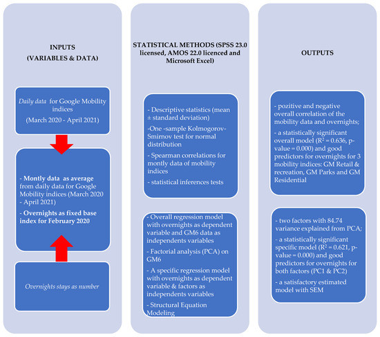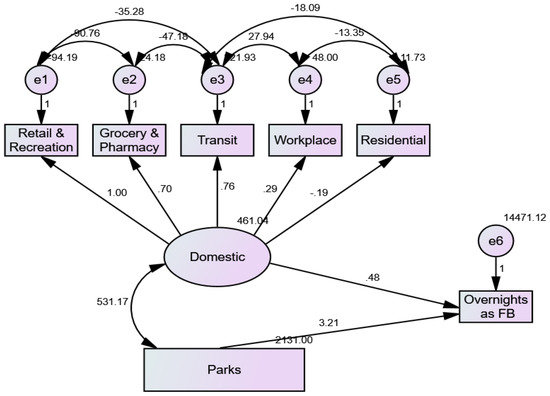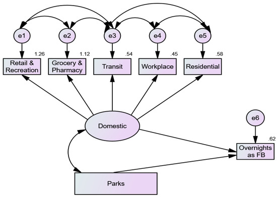 - Structural Equation Model (SEM) framework with SPSS—AMOS software was used to investigate the direct and indirect effects of independent variables, the Google Mobility data [33], on the dependent variable (overnight stays, as a fixed base for February 2020) considering the intervening effects of the mediators. This method was used by Rahman et al. [33] at the early stage of the pandemic to find a pattern in changing mobility of people from 88 countries around the world, and we used this method for all 41 counties (and Bucharest) of Romania. Rahman et al. [33] used only four of the six Google Mobility data dimensions, respectively: retail and recreation, transit, workplace, and residential, without parks, and grocery and pharmacy.