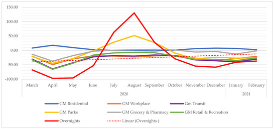 The time series for the period of March 2020–February 2021, for all the variables from the research, are presented in the Figure 2, along with the trendline for overnights as a fixed base for February 2020.