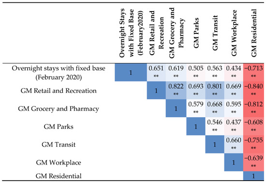 - Models 2–4, with all six Google Mobility indices as independent variables and the overnight stays (as a fixed base index) as the dependent variable by using the forward method for the regression model;