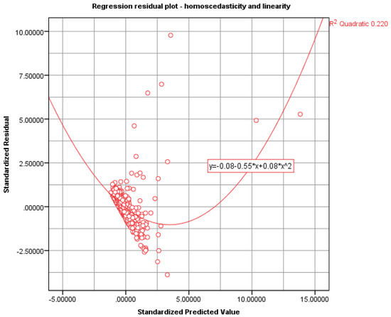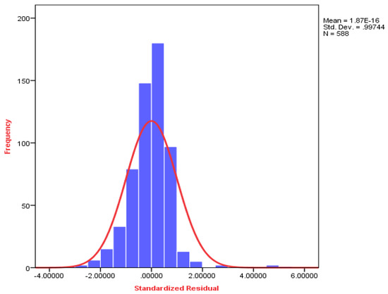 The histogram (Figure 4), the normal P-P plot (Figure 5), and the regression residual plot—homoscedasticity and linearity (Figure 6) are presented below.