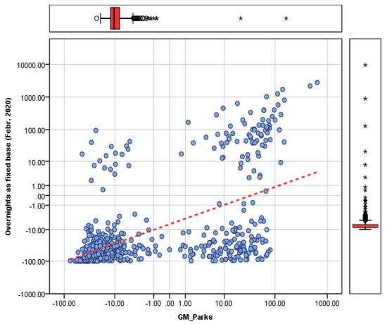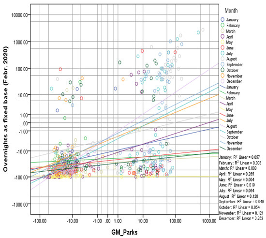 Figure 7, Figure 8 and Figure 9 represent the regression line for each of the statistically significant predictors for overnights as a fixed base for Romania during March 2020–April 2021, with the dependent variable increasing in regards to the Google Mobility parks and Google Mobility retail and recreation and decreasing in regards to Google Mobility residential. Figure 10 presents the scatter plots for overnights as the dependent variable and Google Mobility parks as the independent variable for each month to emphasize that during the well-known time for holidays, the variations of overnights are explained regarding GM parks as follows: for April 2020, 37% (R2 = 0.368), for July 2021, 78% (R2 = 0.781), and for August 2021, 72% (R2 = 0.716), according to data from Figure 10.