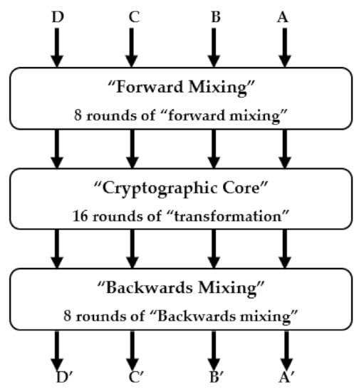 - Backward Core Level: A keyed unbalanced Feistel encryption of eight rounds, which resists cryptanalytic assault by combining S-box lookups, data-dependent rotations, multiplications, xors, and additions.