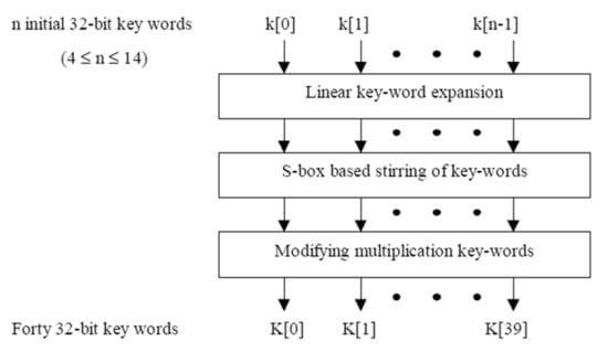 MARS allows user keys ranging in length from 4 to 14 words (128 to 448 bits). For the encoding procedure, MARS employs key expansion technique for expanding the key of the user into a key array K[] comprised of 40 words, as shown in Figure 2. Three steps make up the essential expansion process. The first phase is linear expansion, which employs a simple linear transform to expand the original user-supplied key to forty 32 bits. While the second phase utilizes “S-box based key stirring,” which uses a type 1 Feistel structure to stir the extended key. In a multiplication keyword modification step, the keywords utilized in the ciphering/deciphering processes of multiplying are examined. MARS likewise uses a table of a single S-box with bit words 512-32. This S-box is also utilized in the process of the key expansion. The S-box is split up into two tables, each with 256 entries: S0 and S1.