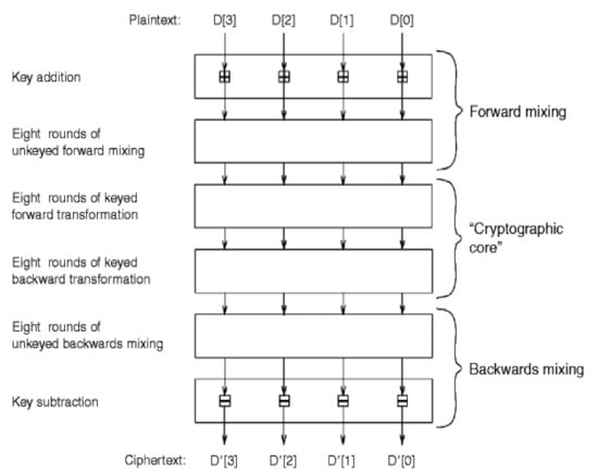 - Burwick, C.; Coppersmith, D.; D’Avignon, E.; Gennaro, R.; Halevi, S.; Jutla, C.; Matyas, S.M.; O’Connor, L.; Peyravian, M.; Safford, D.; et al. The MARS Encryption AlgorithmI. BM, 27 August 1999. Available online: http://citeseerx.ist.psu.edu/viewdoc/summary?doi=10.1.1.35.5887 (accessed on 2 June 2022).