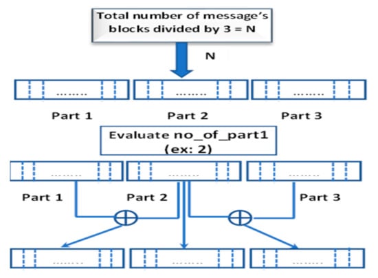 At the second step: We divide the ciphertext into three parts of blocks, we first evaluate the number of sub-blocks in each part by dividing the total number of the message’s blocks by three.