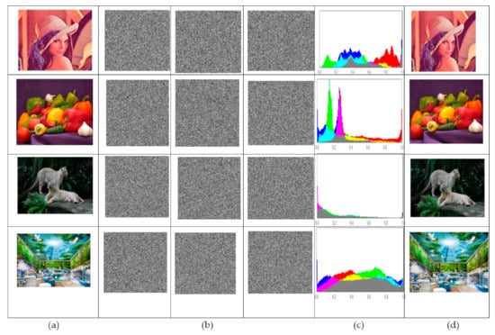 The algorithm is applied to the images of Lena, Pepper, Tigers, and Nature. The suggested symmetric encryption and decryption system is implemented using the ‘Mathematica 13’ program. Figure 7a shows the original plain images with a size of 512 × 512 pixels. The components “RGB” of the matching cipher image are created using the encryption procedure, as shown in Figure 7b. Then, using the proper secret key, we decrypted the cipher image in Figure 7b to obtain the perfectly reconstructed image in Figure 7d. Figure 7c shows the histograms of the plain images. The pattern of the cipher image is noise-like and unrelated to the original plain image, as shown in the Figures. The image that was retrieved is flawlessly restored.