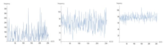 Figure 9 indicates that the ciphertext image’s histogram is distributed uniformly, withstands the statistical assaults, and is demonstrated using the chi-square test denoted as: