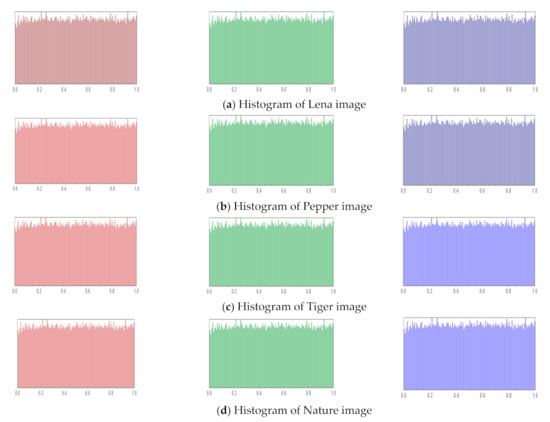 The way that an image’s pixel values are distributed is represented by the histogram. The histogram values in an encrypted image should have a uniform distribution, making it difficult for the attacker to discover anything about the image. The uniform distribution of pixel values in a coded image demonstrates the applicability of the proposed encryption approach. Figure 9 shows the encrypted images’ histograms.