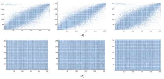 The correlation for the Nature image and its cipher: (a) Relationship between neighboring pixels in horizontal, vertical, and diagonal directions of plain Nature image; (b) Relationship between neighboring pixels in horizontal, vertical, and diagonal directions of cipher Nature image.