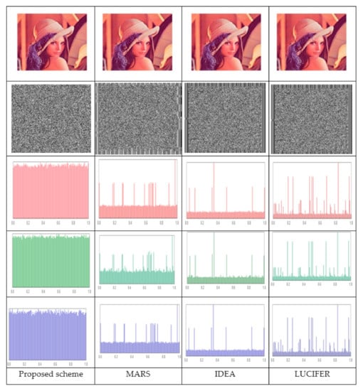 The suggested scheme is complemented with alternative methods, employing correlation analysis, entropy, NPCR, and UACI, and for the Lena image of size 512*512 in Table 10 comparing our system with other systems: MARS [], IDEA [], and LUCIFER []. Figure 11 shows histograms of plaintext Lena’s image and cipher image for the proposed scheme, MARS, IDEA, and LUCIFER concluding that, compared to the other systems, the histogram for the ciphered images in our suggested approach is the most uniformly distributed. These results imply that our cryptosystem has improved histogram assault resilience.