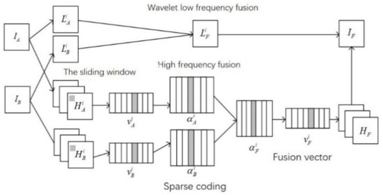 The schematic diagram of the improved sparse representation image fusion algorithm described in this section is shown in Figure 2. DWT transform is used to decompose two-dimensional images into high and low-frequency domain signals. The number of decomposition layers is set to three, and ten correlation components , are generated, respectively.
