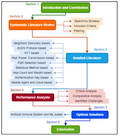 After the critical analysis of all techniques, this SLR presents a detailed performance analysis of all wormhole mitigation schemes, followed by a section presenting the identified challenges. Finally, this SLR concludes that many researchers have presented different techniques based on different objectives. Several methods are evaluated based on detection accuracy, performance, additional hardware used, packet delivery ratio, and energy consumption. Figure 3 presents the organization of the paper.