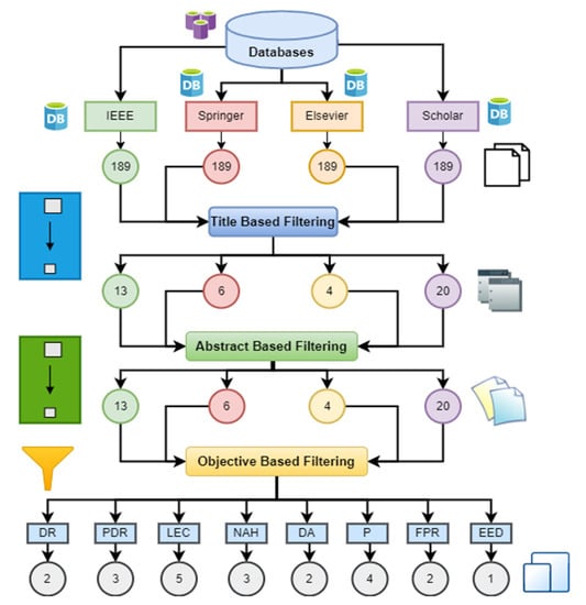 In the filtering phase, the first stage was title-based filtering, as shown in Figure 5. All papers which were not relevant to the topic of the problem were excluded from all the selected databases.
