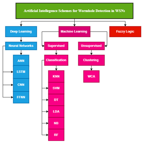 The research of Ref. [36] presented a supervised-based machine learning algorithm for intrusion detection. It uses decision tree algorithms named C4.5 and CART to identify network patterns. The results of the proposed approach were compared in terms of different network parameters, such as accuracy, number of nodes, number of training samples, and number of attackers. The results show that C4.5 attained a higher accuracy (70%) than the CART classifier. Figure 6 shows the classification of AI-based schemes for wormhole detection in WSNs.