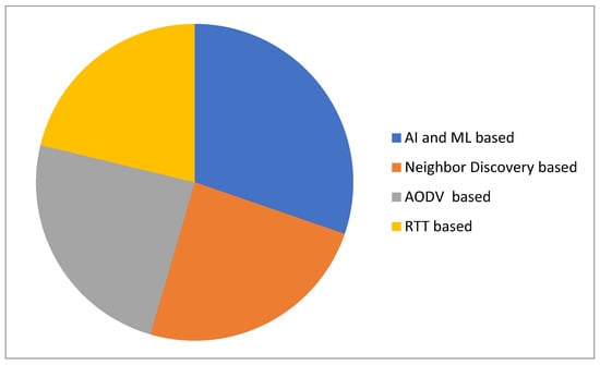 All of the above analysis shows that AI- and ML-based techniques are better than the state-of-the-art techniques in terms of detection accuracy, PDR, FPR, PLR, energy consumption, and transmission rate. Figure 7 compares the detection accuracies of AI- and ML-based schemes, neighbours discovery-based schemes, AODV-based schemes, and RTT-based schemes. AI- and ML-based schemes achieve higher detection accuracy than the other categories.