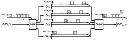 The architecture of a pipeline is proposed. The continuous operating character of the pipelined module and obtaining results for different elements of the input vector data_in at each step are provided by compensating the calculation iterations by the number of used computing units (Figure 2); here, N is the number of used CUs; is the length of the vector under processing; j is the ordinal number of the vector element. The number of the model iterations for one scalar input value is (data_out_size + 1).