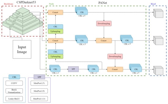 Figure 1 shows the network structure of YOLOv4. It consists of a backbone with CSPDarknet 53, a neck with a Path Augmented Network, and heads. The backbone extracts the feature map from the input image. The neck is a recently used structure placed between the backbone and the head. It is used to collect features from the various stages within the neck; it is built using a few bottom-up, top-down paths. The head predicts the category and bounding box of the object.