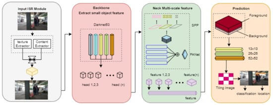 The proposed small object detection algorithm proceeds with input, backbone, neck, and head output. The input part performs ISR processing, extracts small object features from the backbone image, the neck fuses multi-scale features, and the prediction specifies detection using a multi-scale feature map. The algorithm is shown in Figure 2. The ISR module was added to the input to capture local details of small targets. The main extracted content used texture extraction for image enhancement and texture extraction for image identification. In the backbone network, blocks in Darknet53 are connected in the same way as each layer in DenseNet []. We use this specific association for training deeper network structures and for neuronal modes of functional maps learned at different levels. This connection can avoid overfitting with fewer parameters than other networks; the neck requires fewer parameters than other networks and avoids overfitting. The neck part maintains the PAnet structure and the original spatial pyramid pooling structure. PANet is a functional fusion module of this part, combining different scale functions. Spatial pyramid modules are structures added to the neck to amplify the usable fields of the network. YOLOv4 [] was selected as the head, and a loss function was added to the foreground and background balance loss, reliability loss, and classification loss due to bounding box regression to improve the accuracy of small object detection.