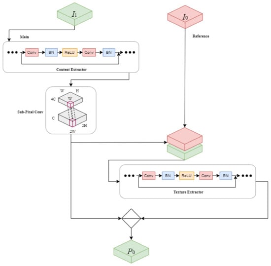 The ISR module input is split into two parts, content and local textures, as shown in Figure 3. It is first extracted with a content extractor, and then sub-pixel convolution is used to double the resolution of the content feature. The texture extractor connects the two parts to the output terminals while selecting a trusted local texture from the base and reference and function and denoising the reference function []. P0 represents the output of the image super revolution module and is defined as: